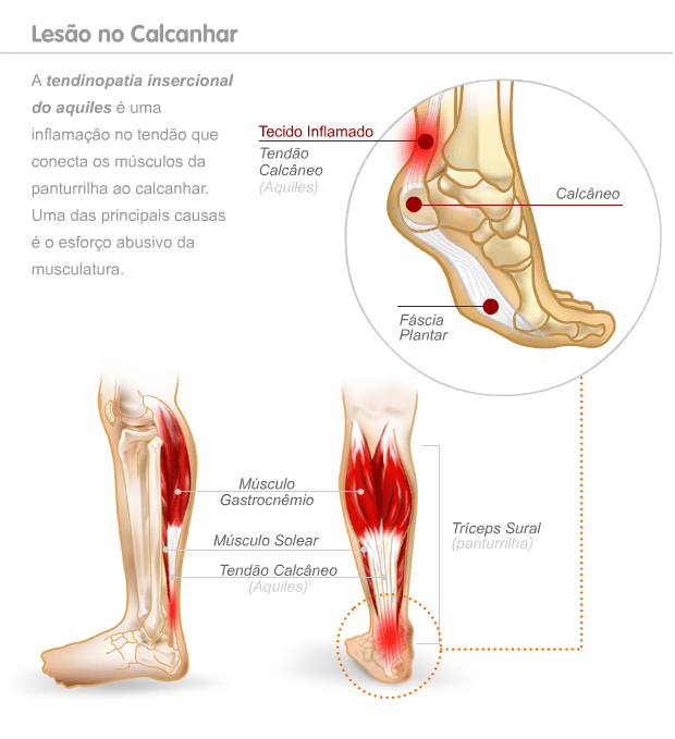 “As causas mais comuns para esta lesão são alterações da posição do pé, como o abatimento da região interna do pé durante a marcha ou andar, que aumenta a exigência sobre o tendão de Aquiles; o encurtamento muscular dos gémeos, que resulta numa diminuição da capacidade de movimento do pé; o uso de calçado inadequado ou desconfortável para a prática desportiva;…”
